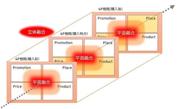 Another example involves attaching sensors to commercial printers that send real-time reorder signals when ink is running low. This mechanism perfectly fuses "Product," "Place," and "Promotion." Since these 4Ps form a strategic framework for the moment customers purchase goods, we call this a "flat fusion" of the 4Ps.