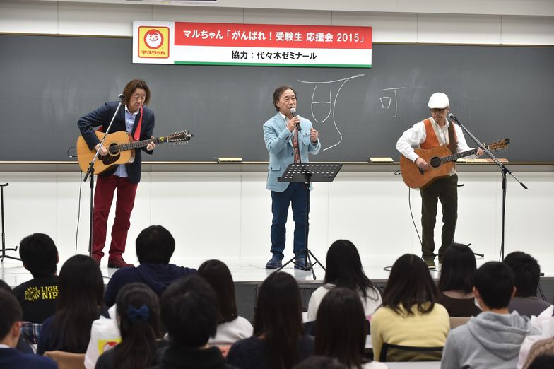 The climax featured a live performance by Akamaru Dash☆ and the Kaien-tai as a rallying cry for the examinees. Akamaru Dash☆ energetically performed "Eat, Laugh, Live On," the CM song for "Maruchan Akai Kitsune to Midori no Tanuki," filling the stage with their spirit. The Kaien-tai passionately sang their famous song "Gift of Words."