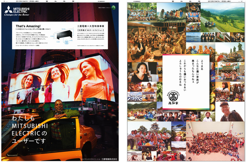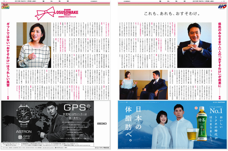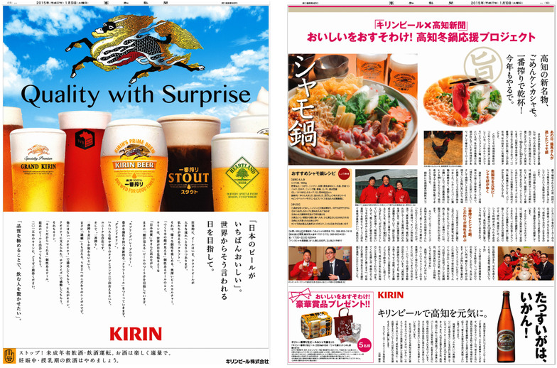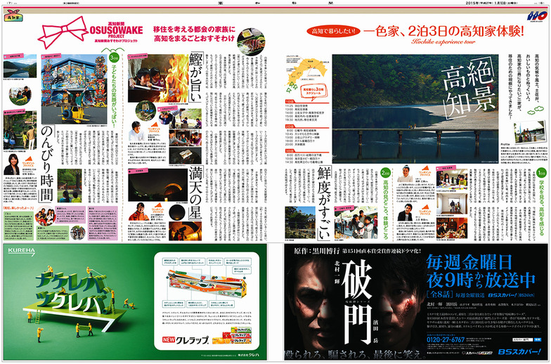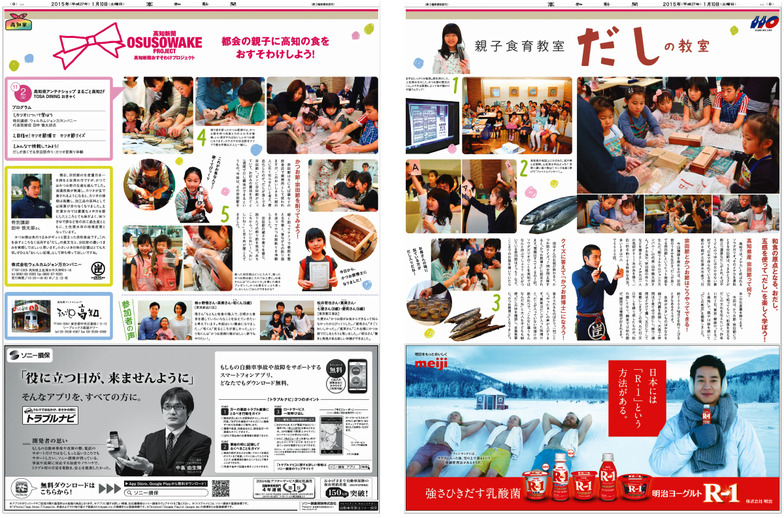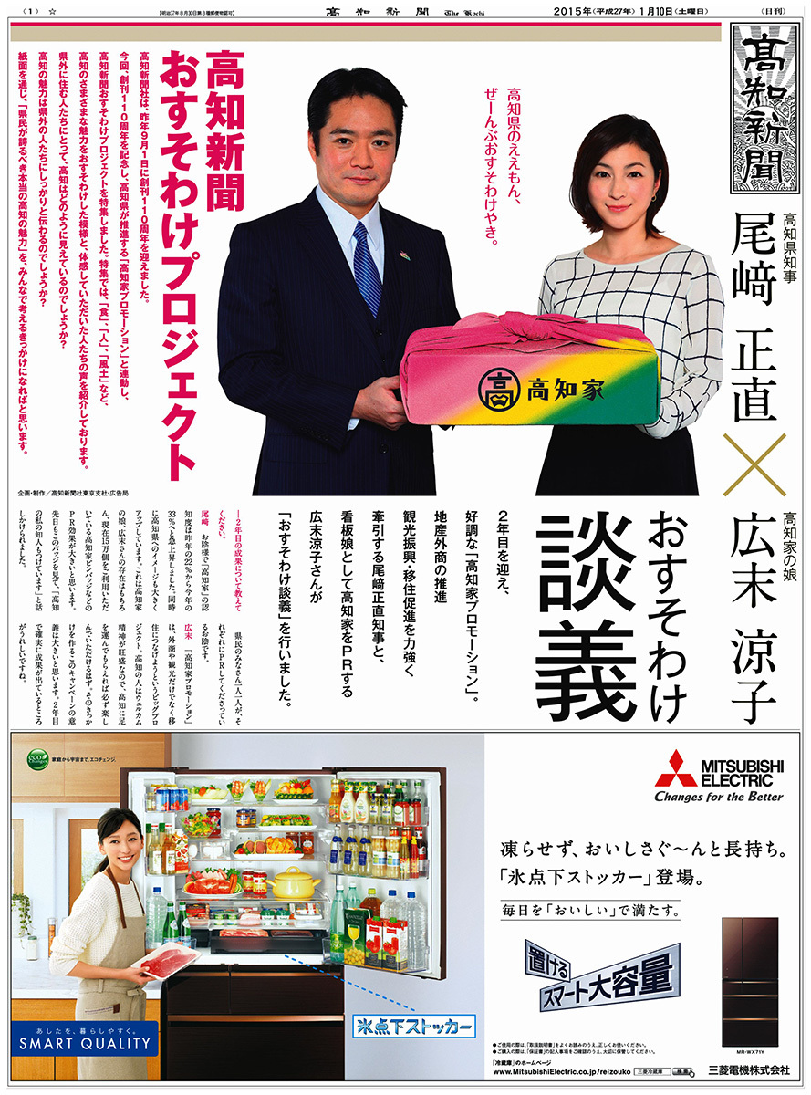 On January 10th, commemorating its 110th anniversary (founded September 1904), Kochi Shimbun published a 12-page color special supplement titled "Kochi Shimbun Sharing Project" (Sponsored by Kirin Brewery, Kureha, Suntory, SKY PerfecTV! Entertainment, Seiko Watch, Sony Insurance, Mitsubishi Electric, Meiji, Yamato Transport). The print run was approximately 190,000 copies.