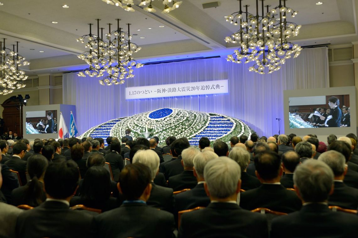 On the 17th, marking exactly 20 years since the Great Hanshin-Awaji Earthquake that claimed 6,434 lives, memorial ceremonies were held across Hyogo Prefecture. At the Prefectural Guest House in Chuo Ward, Kobe City, a ceremony organized by the Hyogo Safety Day Promotion Council was held. Attended by Their Majesties the Emperor and Empress, approximately 500 people participated, including representatives of bereaved families and government officials.