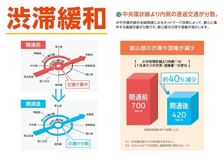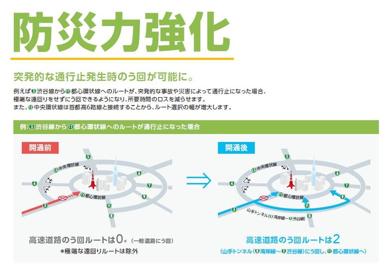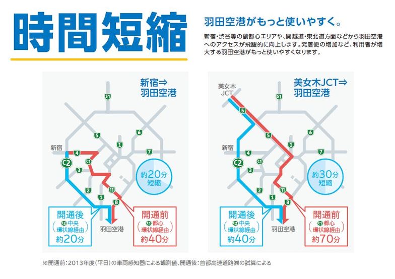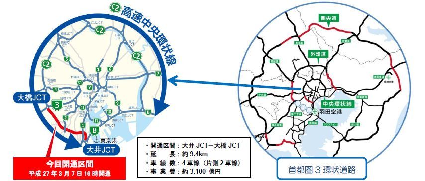 The Central Circular Route is one of the three metropolitan ring roads (Ken-O Expressway, Gaikan Expressway, Central Circular Route). With the opening of the Shinagawa Line, a 46.9-kilometer ring will be completed for the first time, stretching from the Oi Junction in Shinagawa Ward to the Kasai Junction in Edogawa Ward.