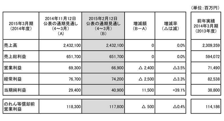 Based on the results for the first nine months, the full-year earnings forecast for the fiscal year ending March 2015, announced on November 12, 2014, has been revised.