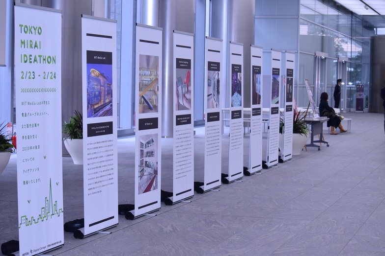 The "Good Entrance, Good Innovation." project stages various initiatives in the lobby of Dentsu Inc. headquarters office in Shiodome, Tokyo. This time, it features an exhibition highlighting the "Tokyo Mirai Ideathon" event, held from February 23rd, which invited research students from MIT Media Lab in the US.