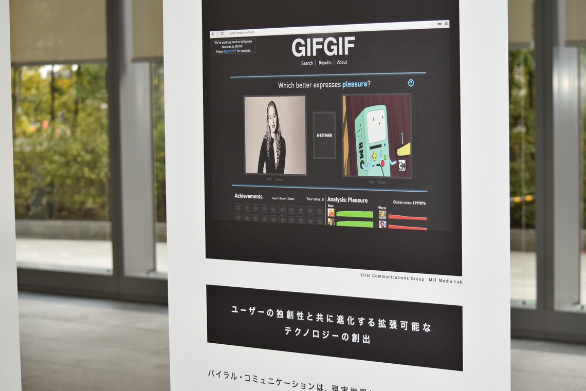 The lobby features event introductions alongside exhibits showcasing MIT Media Lab research projects. The exhibition runs until February 27.