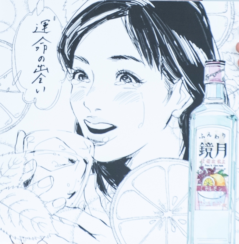 After sampling Shiso Lemon, Ishihara commented, "It's subtly sweet with a refreshing taste that pairs well with meals. I'd love to drink it during cherry blossom viewing this season." On stage, a sketch of Ishihara's "surprised face" – drawn as she teared up over Kagetsu's deliciousness – was introduced. Ishihara added "Fateful Encounter" in the margin.