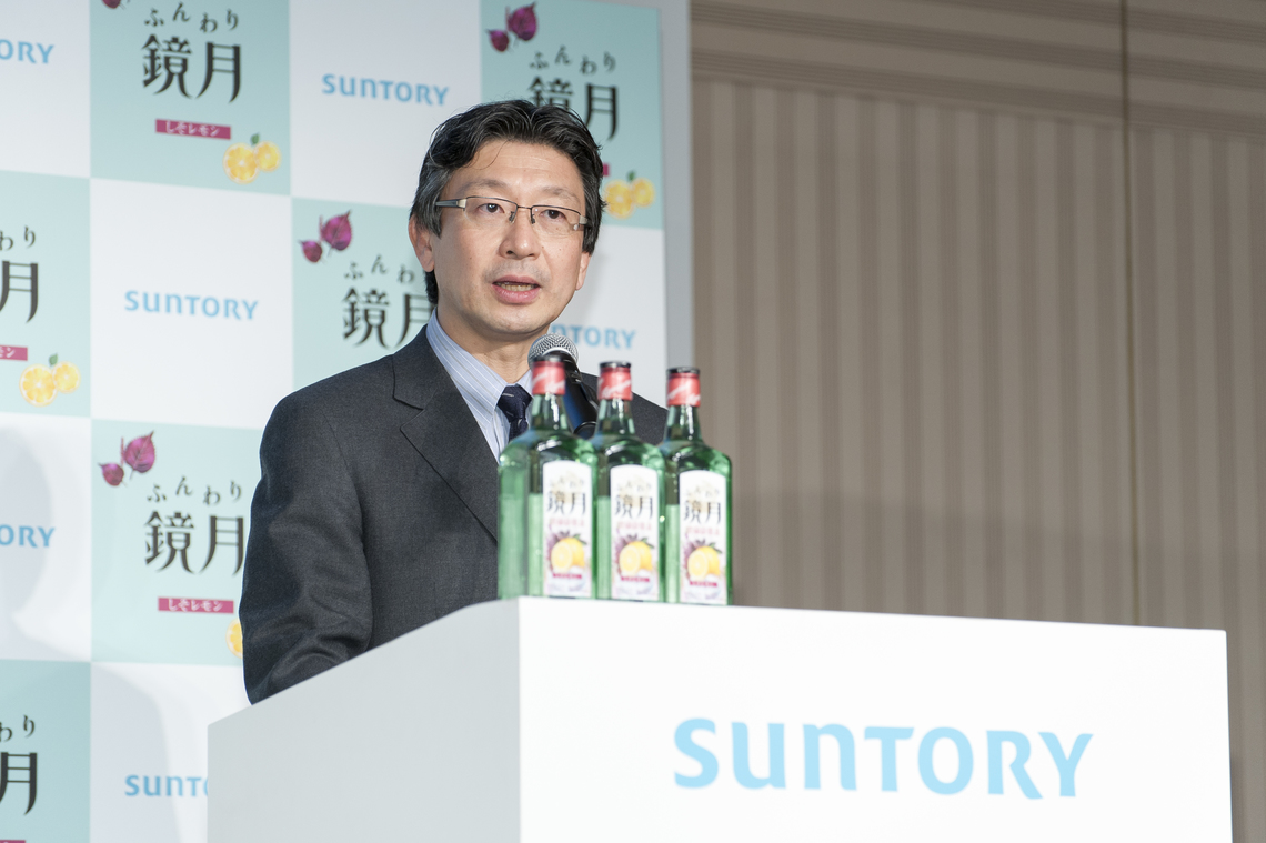 At the start, President Atsushi Koizumi stated, "Sales of RTS (Ready To Serve: beverages that can be enjoyed as cocktails simply by pouring into a glass) are strong, with Fuwari Kagetsu reaching 1.58 million cases last fiscal year. We aim to capture male users with this product and achieve 114% year-on-year sales growth this fiscal year." He also announced the broadcast of the new TV commercial and the opening of a limited-time bar in Tokyo and Osaka called "Fuwari Kagetsu Shiso Lemon: Drink and Be Surprised! Fuwari BAR."