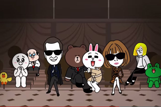 British heritage brand Burberry live-streamed its collection show via the messaging app LINE. For promotion, they created an animated story featuring LINE sticker characters dressed in Burberry checks visiting LFW. The animation featured LINE characters portraying Burberry's own designer Christopher Bailey and Vogue's renowned Editor-in-Chief Anna Wintour (photo).