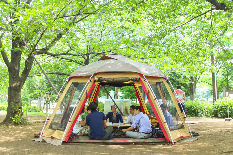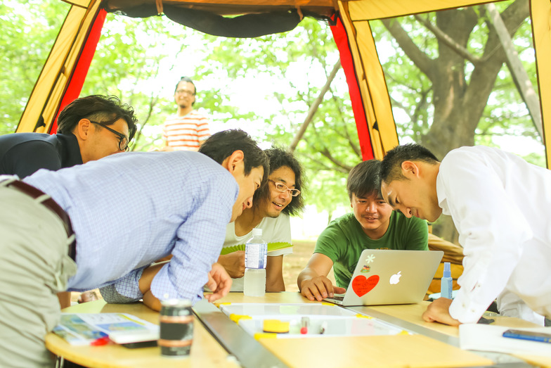 Dentsu Inc.'s 2016 recruitment brochure, titled 'Because there are no answers, there is Dentsu Inc.', also features Kunimi's own approach to work. For example, the 'Outdoor Office' concept involves pitching a tent outdoors and holding meetings from morning to night. Inspired by outdoor gear maker Snow Peak, this style began with the question, "Why do meetings always have to be indoors?" This challenge transformed the quality of ideas and client relationships.