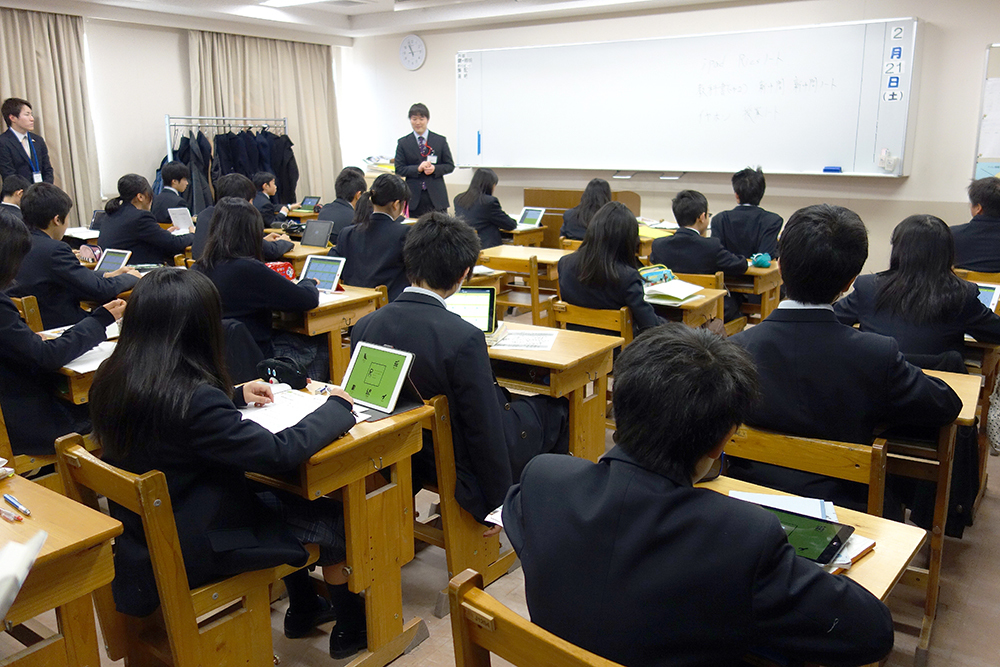 February 21, 2015. An "ICT Open Class" was held at Ritsumeikan Moriyama Junior and Senior High School. Approximately 100 education professionals from across Japan freely observed classes in five different classrooms: Japanese, Mathematics, English, Science, and Social Studies. They leaned in to observe group work activities, moved right next to students to scrutinize their tablet screens, and watched the lessons with great enthusiasm.