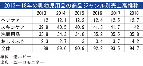 According to UK research firm Euromonitor, India's infant care products market is projected to grow gradually from 8.956 billion rupees (approx. ¥17 billion) in 2014 to 9.4637 billion rupees in 2018. By product category (2014), skincare (4.0482 billion rupees) accounted for nearly half of the total market. Next, toiletries like soap and toothpaste (3.4323 billion rupees) had a high share. In terms of growth rate, while the scale is small, baby wipes are projected to expand by about 1.5 times, from 265.1 million rupees in 2014 to 415.8 million rupees in 2018.