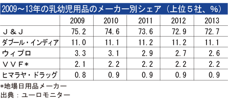 Looking at manufacturer share over the past five years, J&J dominates with over 70%. Local brand Dabur holds about 10%, while Wipro maintains around 3%. Euromonitor notes, "This is a rigid market with little change. J&J's overwhelming brand power stands in the way of growth for new domestic brands like Himalaya Drugs, which are gaining strength."