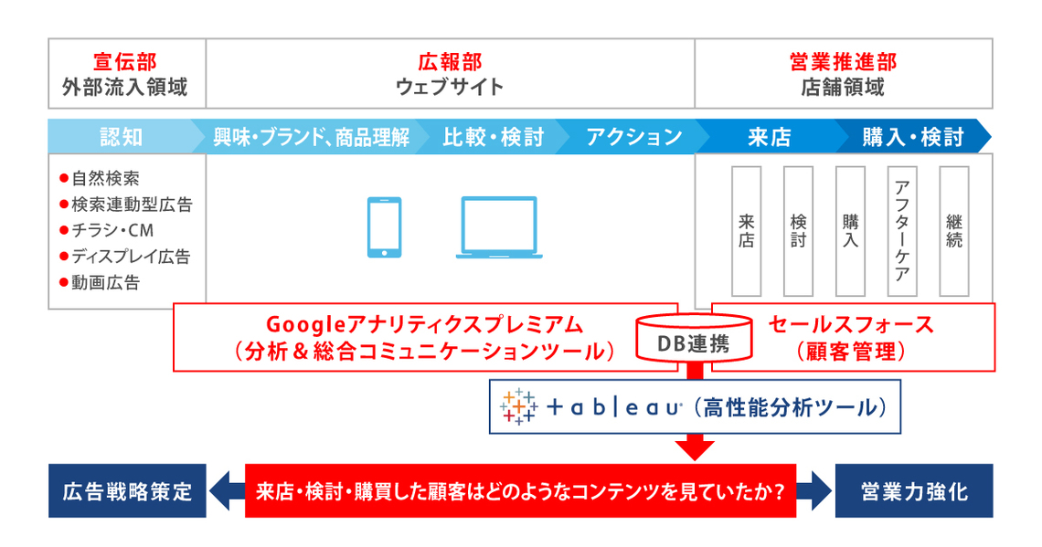 This data is often stored within corporate core systems or held by affiliates rather than the parent company itself. Utilizing it for marketing activities requires the marketing or business departments at headquarters to take the lead and build sophisticated system environments. For instance, in a project like the one shown below, which linked web log data owned by an automotive company's headquarters with sales activity history data held by dealerships, headquarters could enhance communication activities while dealerships could improve their sales activities.