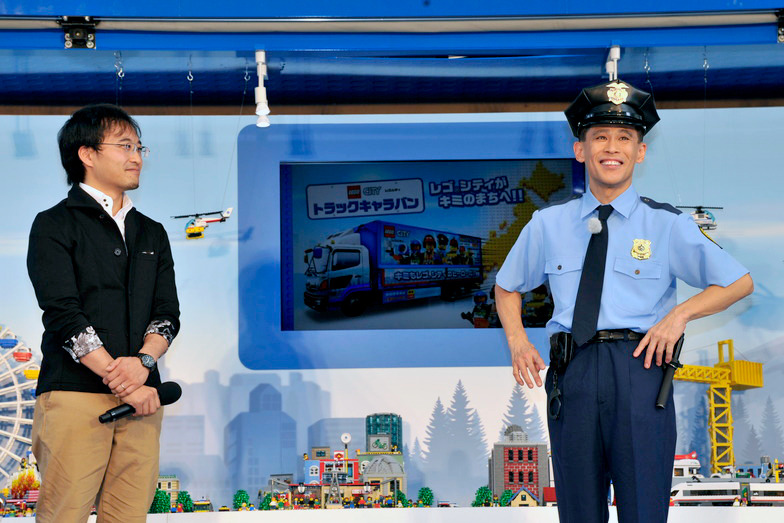 Since the LEGO City series centers on "cities" where everyday heroes thrive, guest Shingo Yanagisawa appeared from inside the truck dressed as a "Police" hero protecting the city's safety. He immediately performed his signature police impersonation. He then proceeded to non-stop impersonate the sounds of various vehicles featured in the diorama: the Shinkansen bullet train, helicopters, and racetracks. Yanagisawa, who shared that he had admired heroes since childhood, introduced the city – the stage for these heroes' exploits – through his impersonations one after another, greatly energizing the venue.