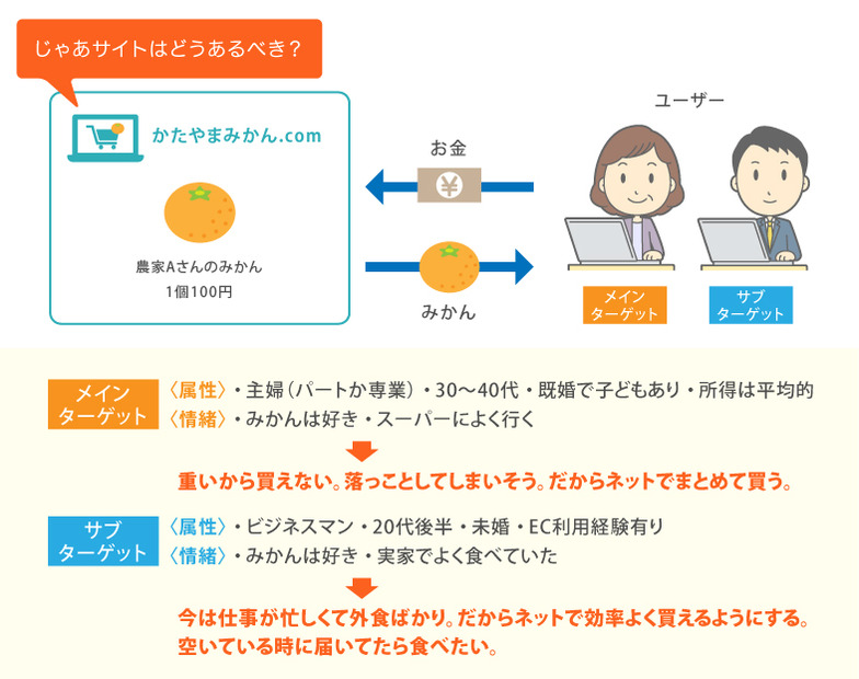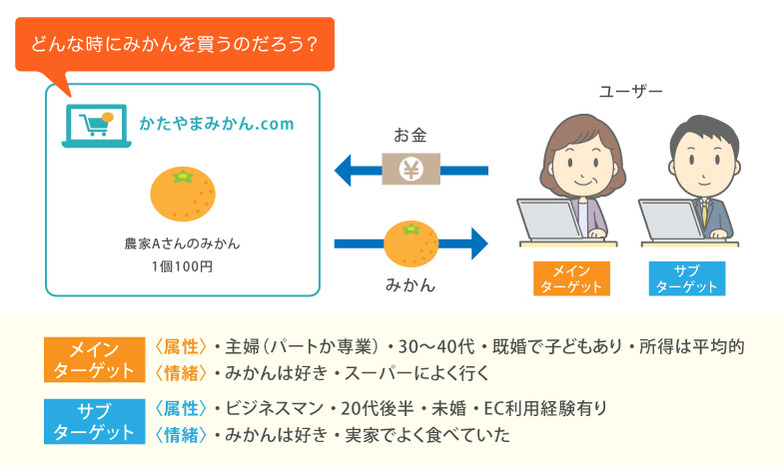 We'll set a main target and a sub-target. Since more housewives are buying online and having it delivered these days, let's tentatively set the main target as housewives shopping for groceries and the sub-target as people like me, a salaryman in my 20s. This gives us the following: