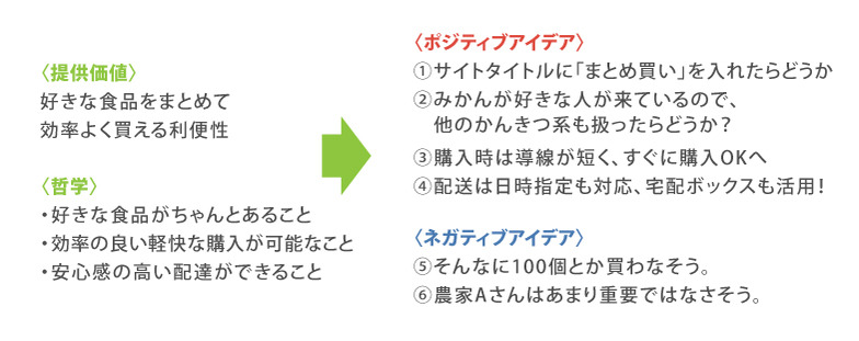 This time, starting from the business idea "We want to sell Farmer A's mandarins," we proceeded as follows: ① First, we considered the sales mechanism, ② then identified the likely buyer demographic as our target, ③ subsequently organized the patterns in which the target would purchase, ④ then considered the value inherent in e-commerce, and ⑤ finally refined the idea. However, in practice, for steps ① to ③, the target may come first, or the use case may be identified first, leading to a deeper exploration of the target profile. Therefore, when considering the value proposition, the order is not fixed.