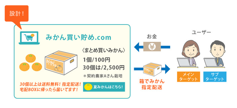 For example, let's say I love mikan oranges and want to partner with a farmer I know, Farmer A, to launch an e-commerce site selling mikan online. What would this site offer users and society? Could we build a service that sells a lot? Let's think about it together.