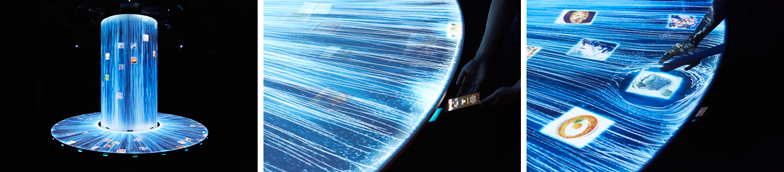 A waterfall of diversity featuring approximately 1,000 pieces of content related to Japanese food and culinary culture. Visitors can touch cards that catch their interest to download the information to their smartphones.