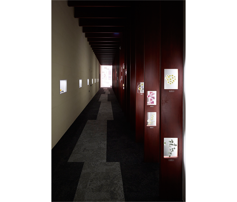 A corridor of hospitality. Introduces seasonal festivals through pressed flower art, accompanied by sound and scent installations.