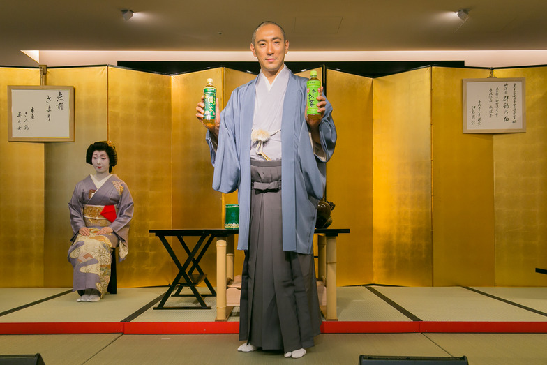 Next, Ichikawa Ebizo, currently performing in the Kabuki-za's Dan-kiku Festival May Grand Kabuki, made an appearance. Ebizo, who has served as the commercial character for the "Oi Ocha" series for 15 years, referenced the proverb "Morning tea brings good fortune" used in the new TV commercial "Morning Practice" edition. He emphasized his daily tea habit, stating, "Every morning, after waking up, I prepare and drink matcha."
