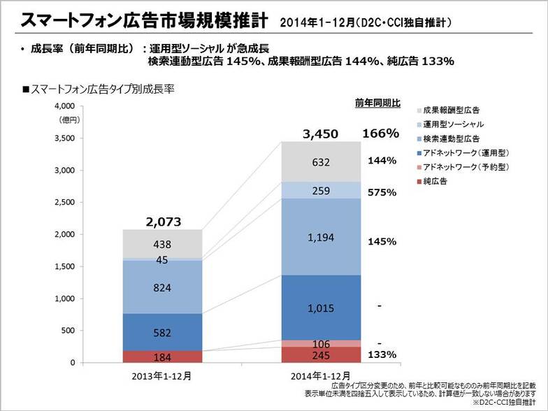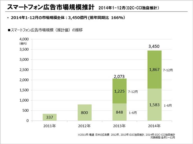 Reference: D2C Inc. Smile "What was the 2014 Smartphone Advertising Market Size? ~Full Year 2014 (Jan-Dec)~ ※D2C/CCI Original Estimates" http://www.d2c-smile.com/201505134559