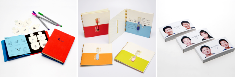 "5fun dake―A guidebook featuring a 5-minute hourglass embedded in the book's center. Flipping it allows father and child to take turns giving and receiving for just 5 minutes a day" (center photo)