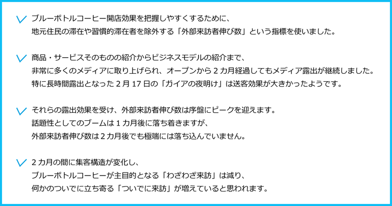 Furthermore, on February 17th, Blue Bottle Coffee was featured for nearly 20 minutes on the TV program "Gaia no Yoake," generating numerous tweets. External visitor numbers saw a significant increase on February 20th, indicating a substantial effect.