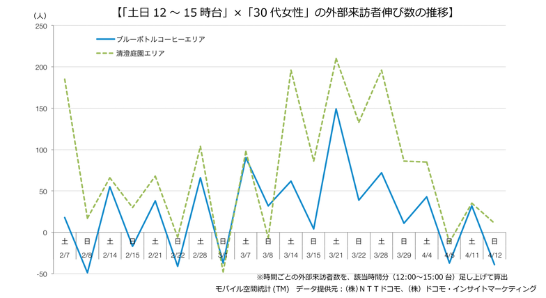Comparing the trends in visitors to the Blue Bottle Coffee area on holidays with those to the adjacent Kiyosumi Garden area reveals a highly correlated movement, suggesting that Blue Bottle Coffee serves as a catalyst for exploring the neighborhood.