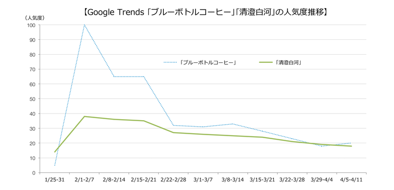 Looking at the popularity trends for "Kiyosumi-Shirakawa" and "Blue Bottle Coffee" on Google Trends, you can see their popularity moves in tandem.