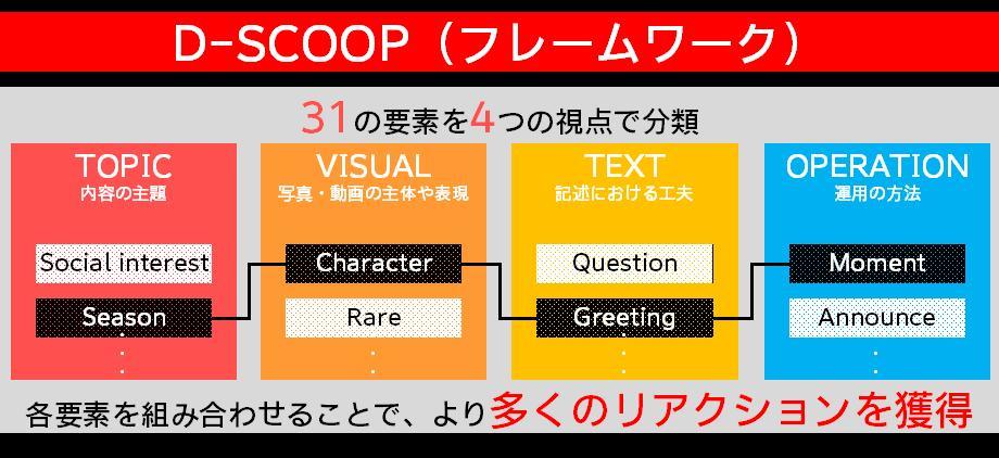 D-SCOOP is a tool providing solutions to these challenges. It suggests optimal posting patterns by combining four perspectives and 31 elements. Simultaneously, it enables comparison with posts from 30 companies across 10 industries with high follower counts and engagement, facilitating benchmarking in areas like balance and reaction rates. This aids in establishing evaluation criteria and building PDCA cycles.