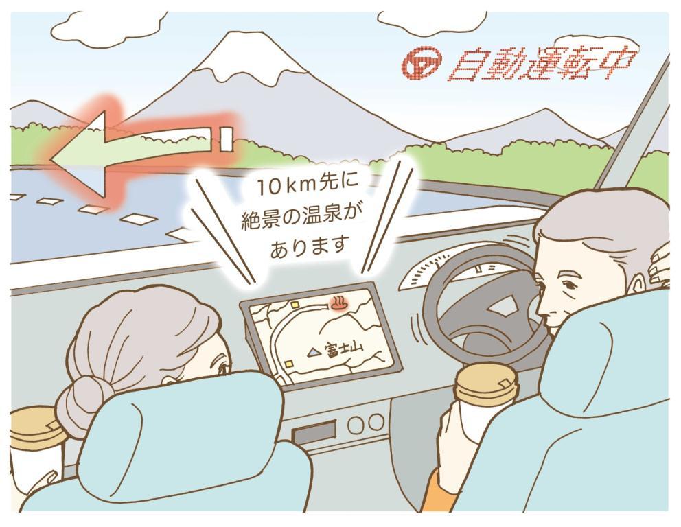 Seniors remain active, and opportunities to drive out in their cars will likely increase. To ensure safe and enjoyable driving for years to come, "fully automated vehicles" may evolve. Simply input your destination and switch to fully automated mode for complete self-driving. With the burden of driving reduced, travel time could become more enjoyable. When visiting tourist spots, these vehicles might even act as tour guides, potentially leading to unexpected encounters and discoveries during trips.