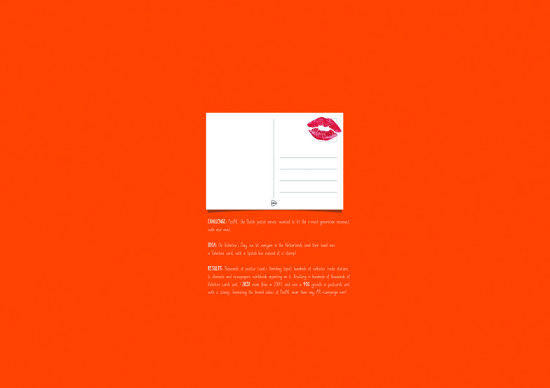 Finally, let's look at this case study: the "A KISS IS A STAMP" campaign launched in the Netherlands for Valentine's Day. Unlike Japan, it's common in Western countries for both men and women to give flowers or cards to lovers or close friends. The post office spotted this trend. They released Valentine's Day postcards featuring a stylish kiss mark printed on the stamp space. They sold like hotcakes—100,000 copies! Sales jumped 283% year-on-year, and postcard sales increased by 40% annually.