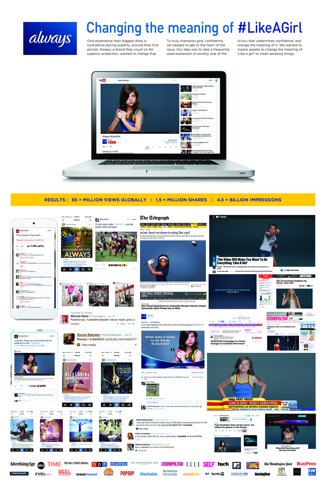 Meanwhile, this campaign uses helping women regain confidence as its entry point while simultaneously aiming to strengthen brand loyalty. Women, in particular, have a strong tendency to continue using products they started using before adulthood, making it highly desirable for brands encountered during this period to be used long-term. According to research, four out of five pre-teen girls responded that "Always is helping change the concept of the phrase 'Like a girl'."