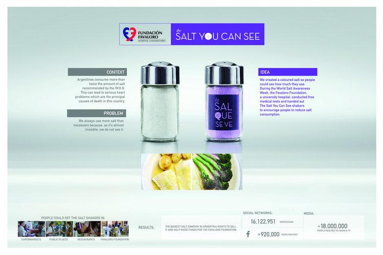 Let me share another example that began by discarding fixed ideas. This campaign, "The SALT YOU CAN SEE," won Bronze in PR and Gold in the Direct category. It was a unique initiative launched during World Salt Awareness Week by an Argentine healthcare advocacy group to curb excessive salt consumption.