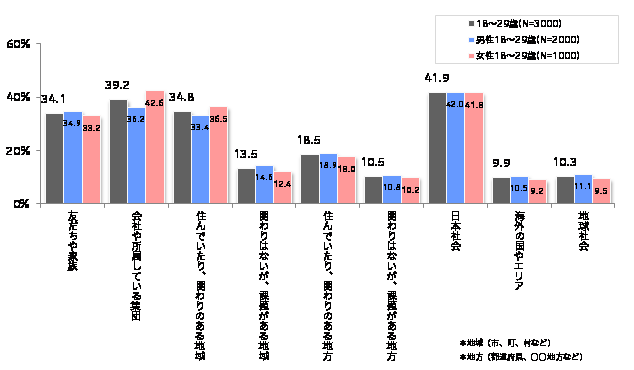 Among those aged 18-29, the top associations with the word "society" were: "Japanese society" (41.9%), "company or group one belongs to" (39.2%), "the local area where one lives or has connections" (34.8%), and "friends and family" (34.1%). This shows that while society is often equated with Japan, people also envision close-knit "societies" like friends and family.