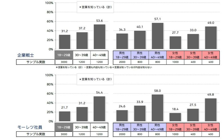 When asked about familiarity with work-related terms, awareness of "corporate warrior" was 53.6% among those aged 40-49, compared to 31.2% among those aged 18-29. Similarly, awareness of "workaholic employee" was 54.4% among those aged 40-49, compared to 21.7% among those aged 18-29, showing a significant generational gap.