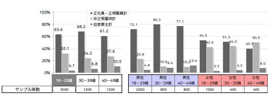 ●Approximately 30% of those aged 18-29 are in non-regular employment. Among women aged 18-29, this figure is approximately 40%. (Figure 1)