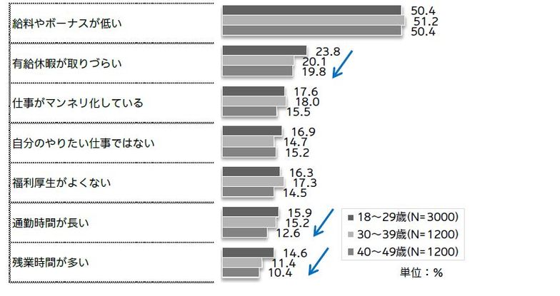 While "low salary and bonuses" ranked high across all age groups, the scores for "difficulty taking paid leave," "long commutes," and "excessive overtime" were higher among younger age groups.