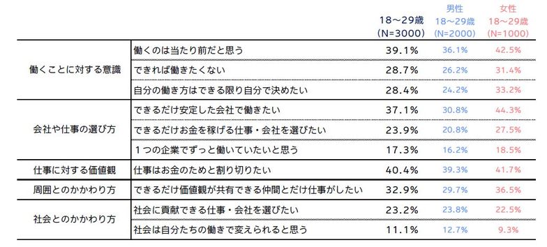 Regarding attitudes toward work, about 40% of those aged 18-29 believe "working is a given" (39.1%), while nearly 30% feel "would rather not work if possible" (28.7%). Regarding work values, while there is a passive mindset such as "I want to view work purely as a means to earn money" (40.4%), there is also an awareness that "I want to decide my own working style as much as possible" (28.4%).