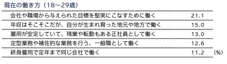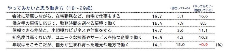 Regarding desired work styles, a significant number of young people expressed interest in diverse and flexible options, such as "working from home while employed by a company" (19.7%) and "working in an environment where hours can be chosen based on the worker's circumstances" (16.4%).