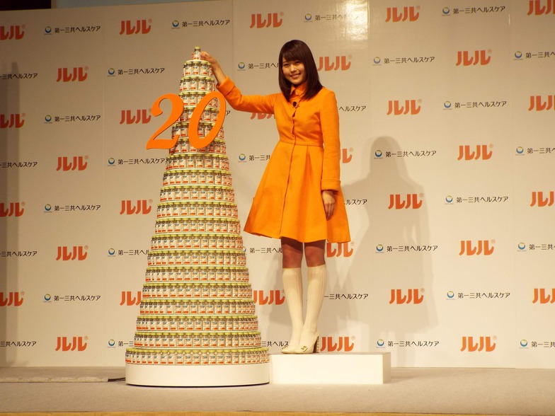 The new commercial was then screened, and amid applause, Ms. Arimura took the stage. After her greeting, she placed the final piece on the commemorative "Lulu Tower" to mark her appointment as the 20th Lulu Girl, completing the tower.