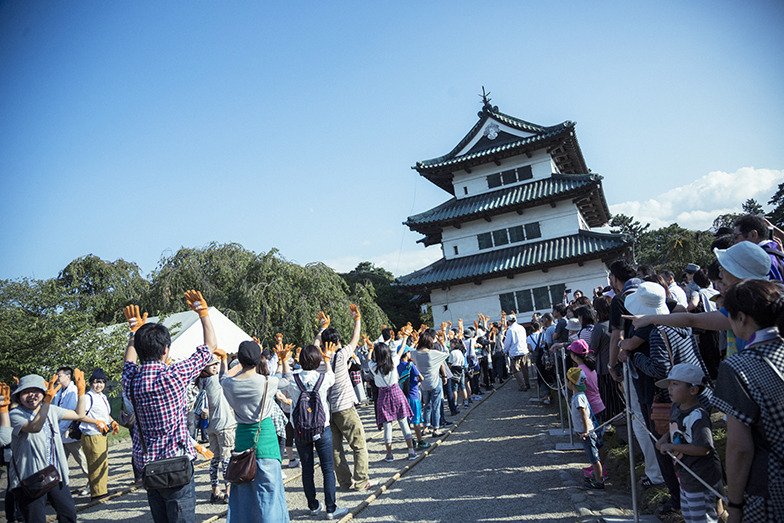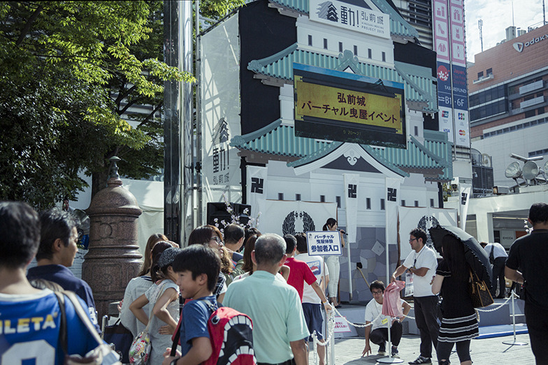 A line of eager participants formed before the suddenly appearing "Hirosaki Castle"