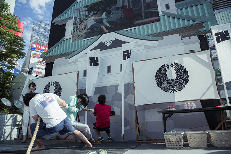 At the Hirosaki Castle Virtual Tug-of-War event, a giant panel depicting Hirosaki Castle's keep appeared at Shinjuku Station's East Exit. Families, friends, and couples formed teams of four to enjoy the tug-of-war experience. Teams challenged themselves to pull 120kg, with their measured results displayed on the venue's screen. Participants received local specialties as prizes based on their performance.