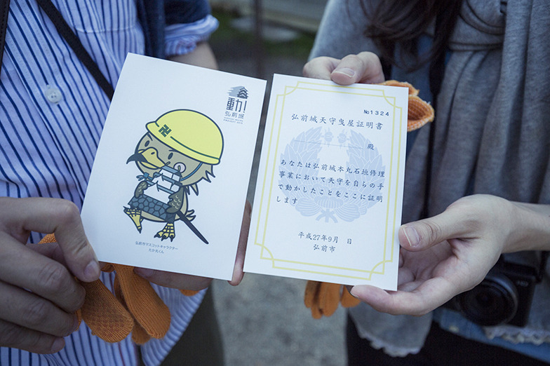During the Hikiyaya Week at Hirosaki Park in Aomori, participants including "Hirosaki Castle Shareholders" (those who made hometown tax donations to Hirosaki City), local residents, and tourists joined in. As about 100 people pulled together on four ropes connected to Hirosaki Castle, the approximately 400-ton keep began to move. Participants cheered at this rare experience of moving a massive castle by human power.