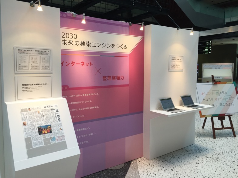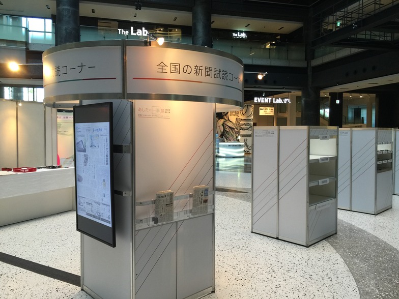 This booth is about the future. The layout of the newspaper pages you casually read every day is actually an extremely calculated, ultimate information design. Applying this technology, what the newspaper company created by 2030 is...!
