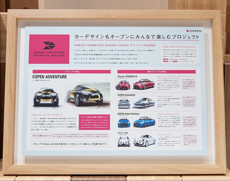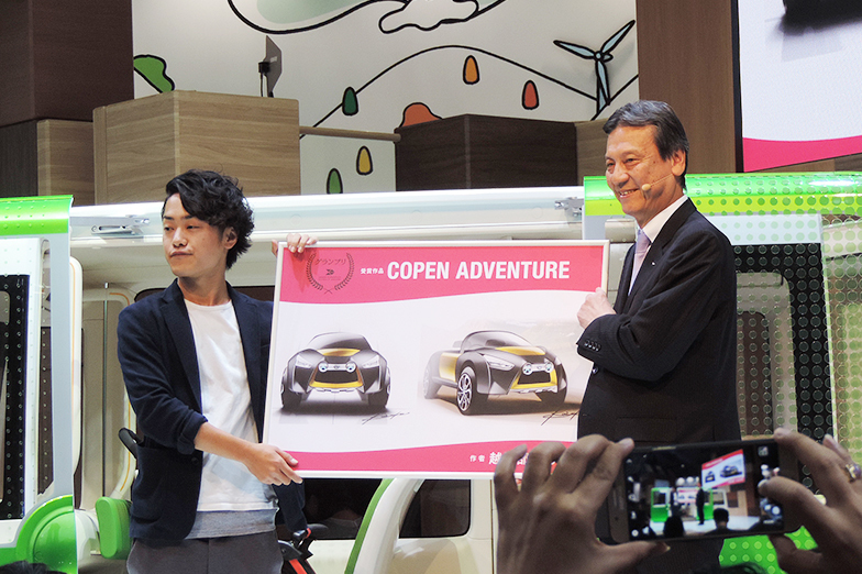 At the start of the press briefing held on October 28, the winning entries for the "DRESS-FORMATION Design Award"—a contest soliciting designs for the kei open sports car "Copen"—were announced. President Masanori Mitsui presented the Grand Prix winner, Keisuke Kosaka, with a trophy.