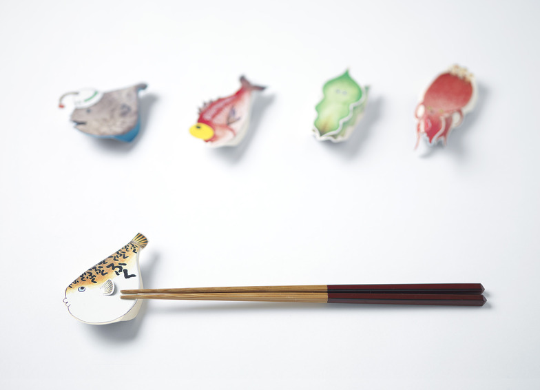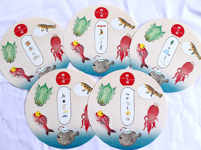 We developed a logo mark for this. Simultaneously, we prepared message cards using the Edo-period game "hanji-e" (picture riddles). These cards convey sentiments like "Thank you," "Live long," or "I'm sorry." Furthermore, cutting out these cards creates chopstick rests shaped like seafood. We wanted to create an entire dining experience, not just gift a single piece of fugu.