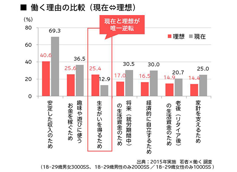 A "Youth × Work" survey conducted by Dentsu Inc. Youth Research Department (Wakamon) revealed that while about 70% of men and women aged 18-29 currently work "for stable income," their ideal is to "gain a sense of purpose" – showing a positive mindset.