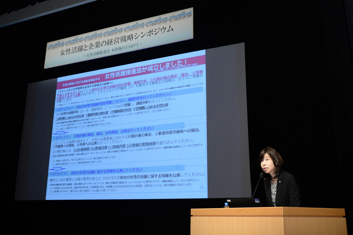 Ahead of the April 2016 implementation of the "Act on Promotion of Women's Participation and Advancement in the Workplace," enacted in August, the symposium aimed to deepen understanding of the law. It also explored future corporate management approaches through case studies of companies proactively advancing women's participation and a panel discussion.
