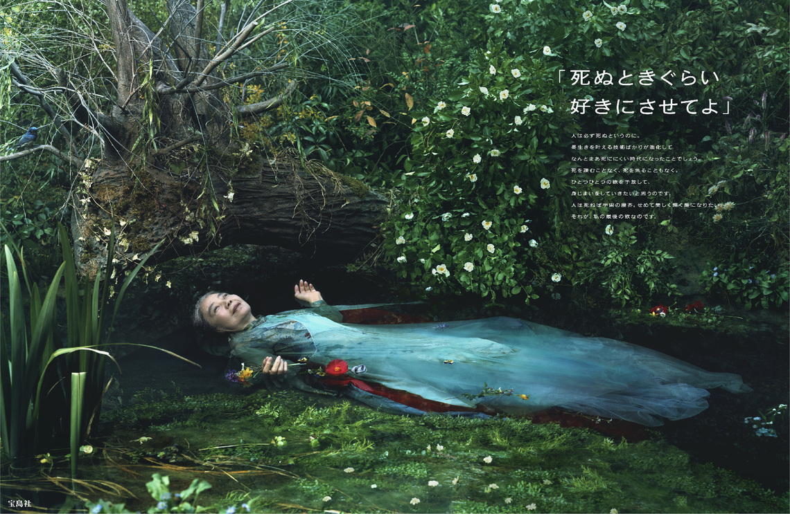The piece is a 15-column color spread featuring actress Kirin Kiki. The visual motif is inspired by British painter John Everett Millais's masterpiece "Ophelia." While the composition remains largely faithful to the original painting, it incorporates modern and Japanese elements, resulting in a fantastical finish. The catchphrase "At least let me die my own way" and the accompanying body copy perfectly matched Ms. Kikuchi's personality, likely prompting many readers to reflect anew on life's journey at the start of the year.