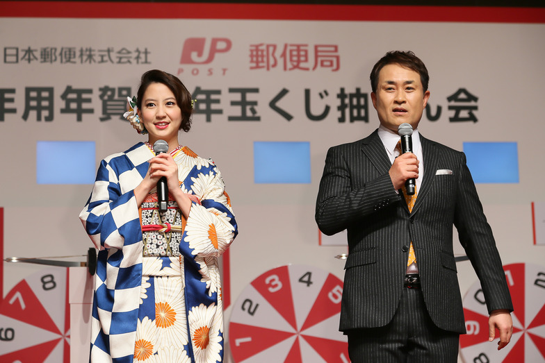 Actress Mayuko Kawakita and impersonator Tsukasa Kanna appeared on the stage set with a roulette wheel and bows and arrows. Kawakita shared an anecdote about New Year's cards: "Every year, I send out cards featuring photos of myself in kimono, adding a handwritten message. I receive about 500 cards myself, so I might win one." Kanna revealed that she exchanges New Year's cards with the athletes she impersonates.